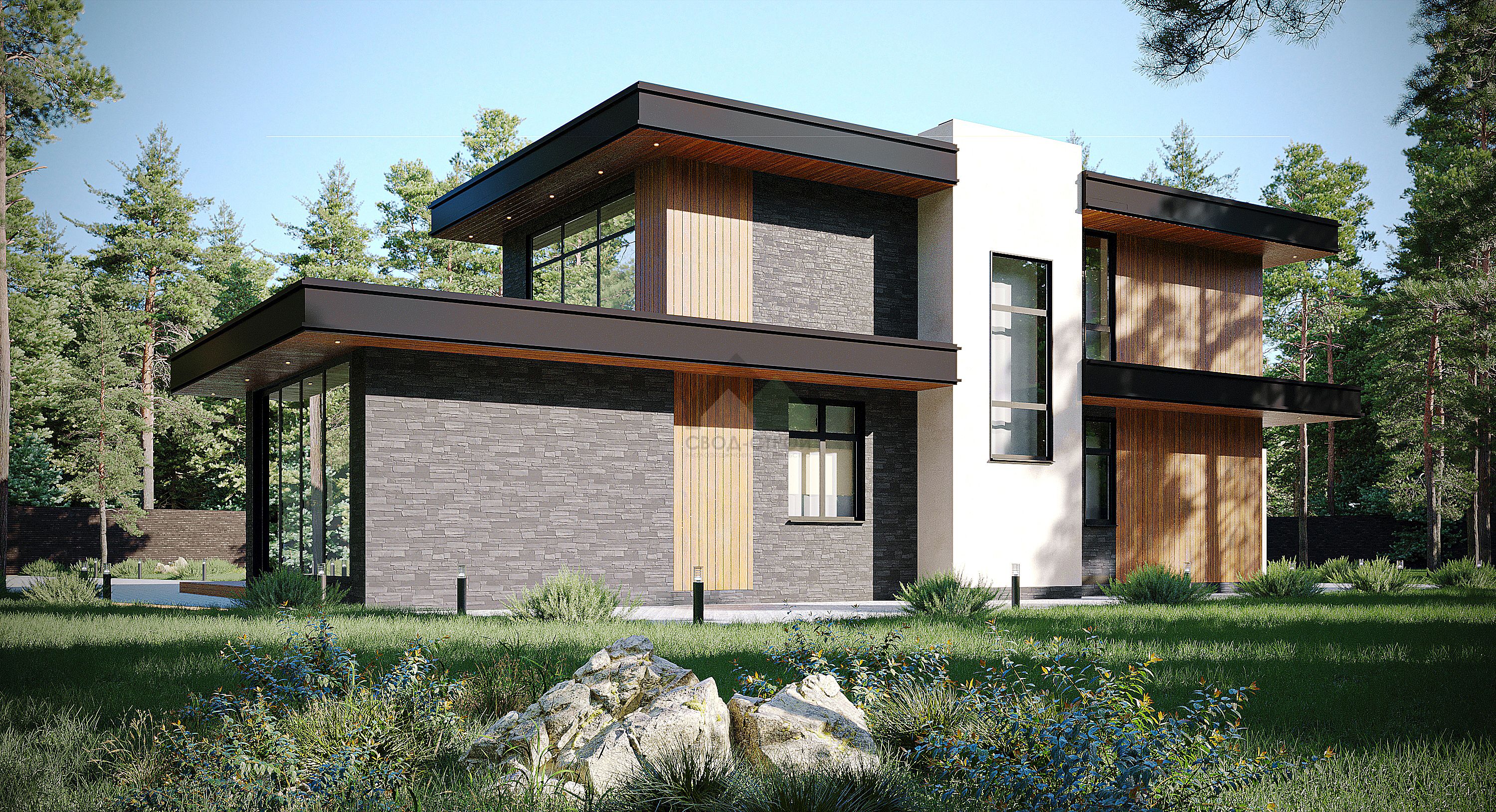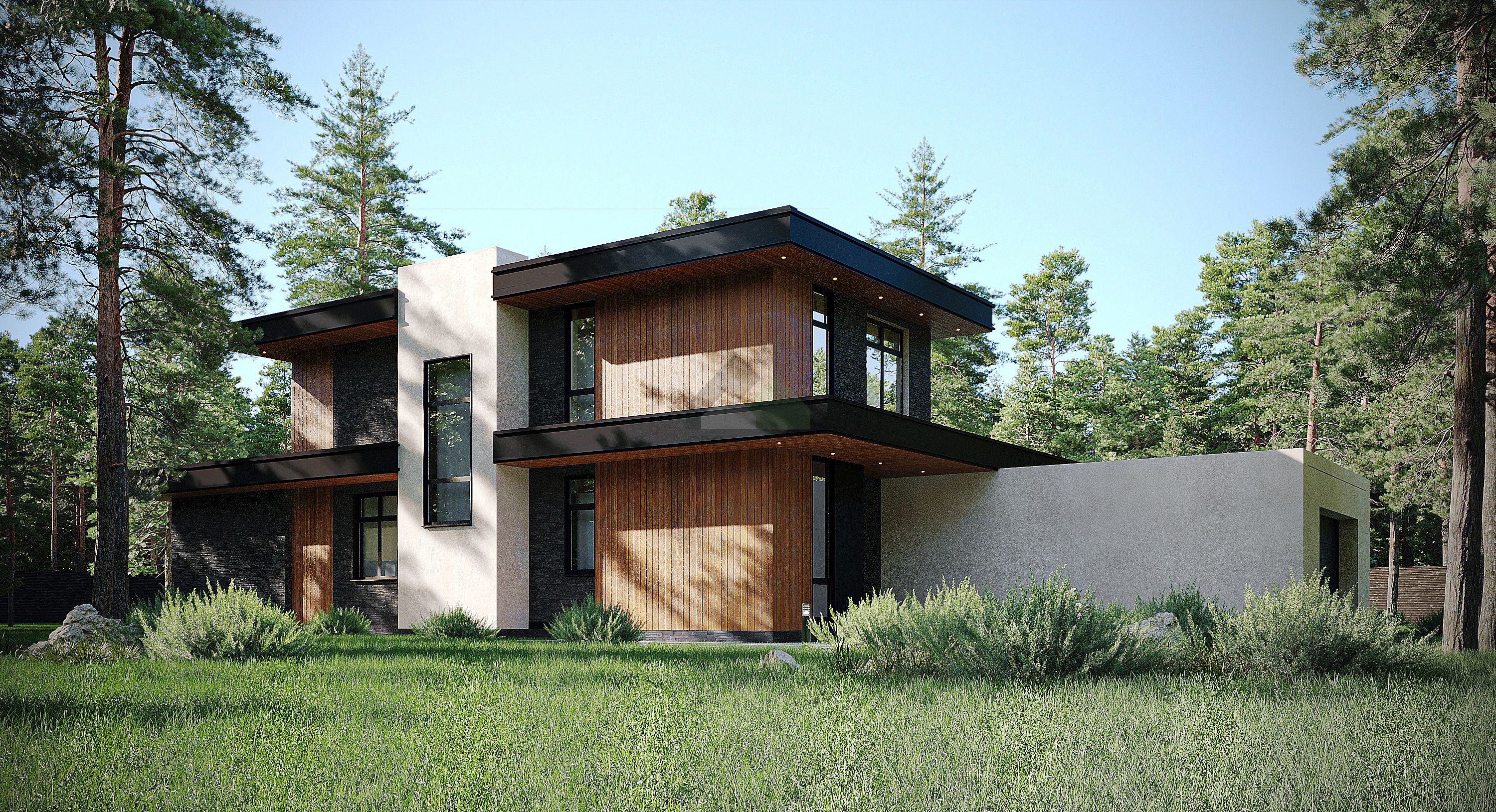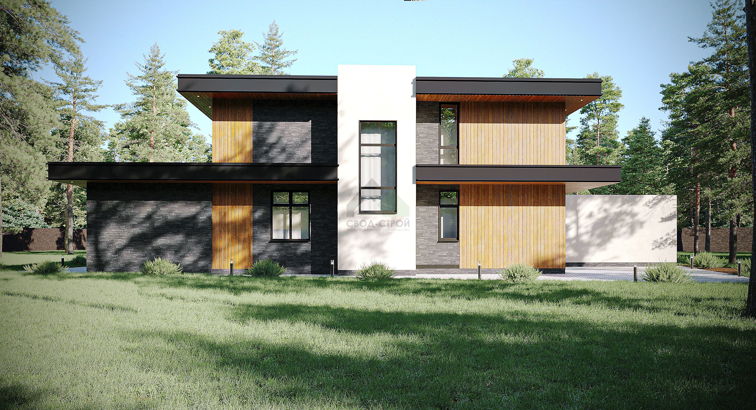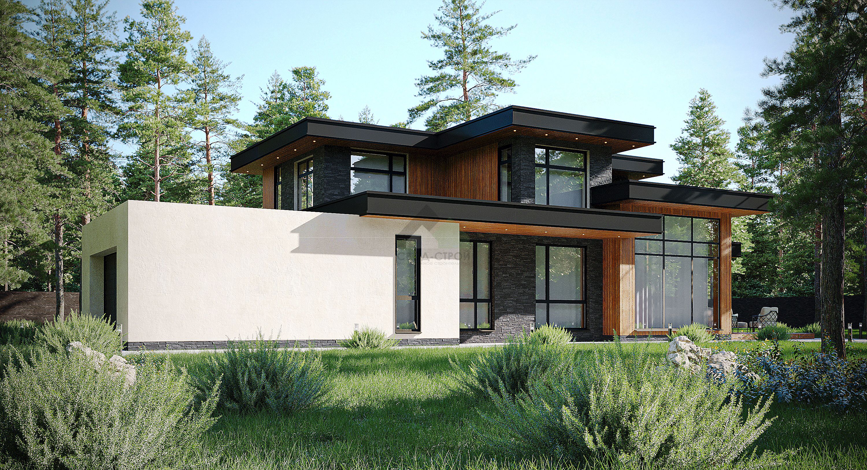 ЭкологичноГармонично впишем дом в ваш участок"Этот современный дом воплощение нашей мечты! Здесь сочетается стиль и комфорт. Изюминка этого проекта- двухсветная гостиная с панорамным остеклением, дающая возможность насладиться садом и солнцем, освещающим помещение."