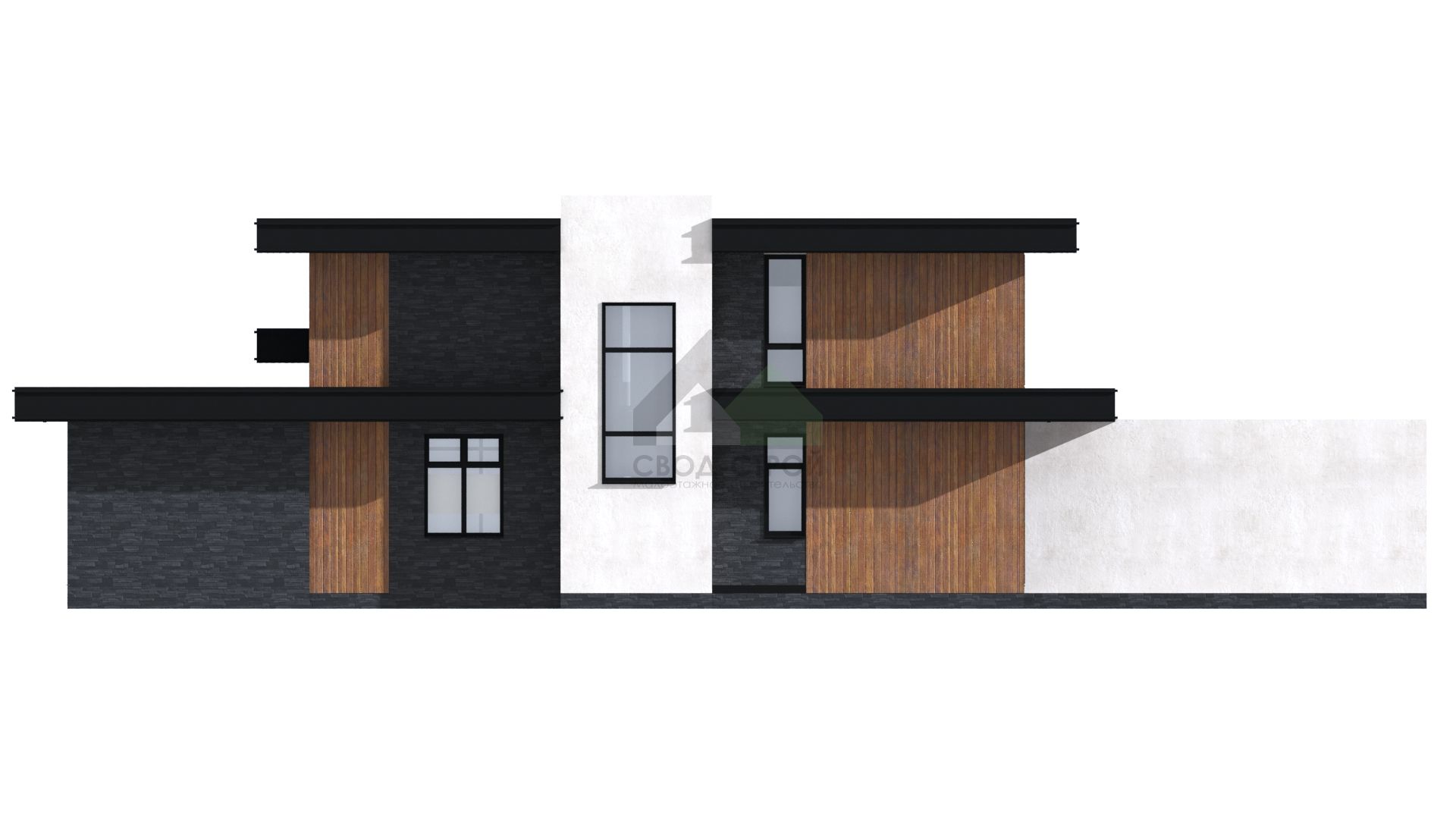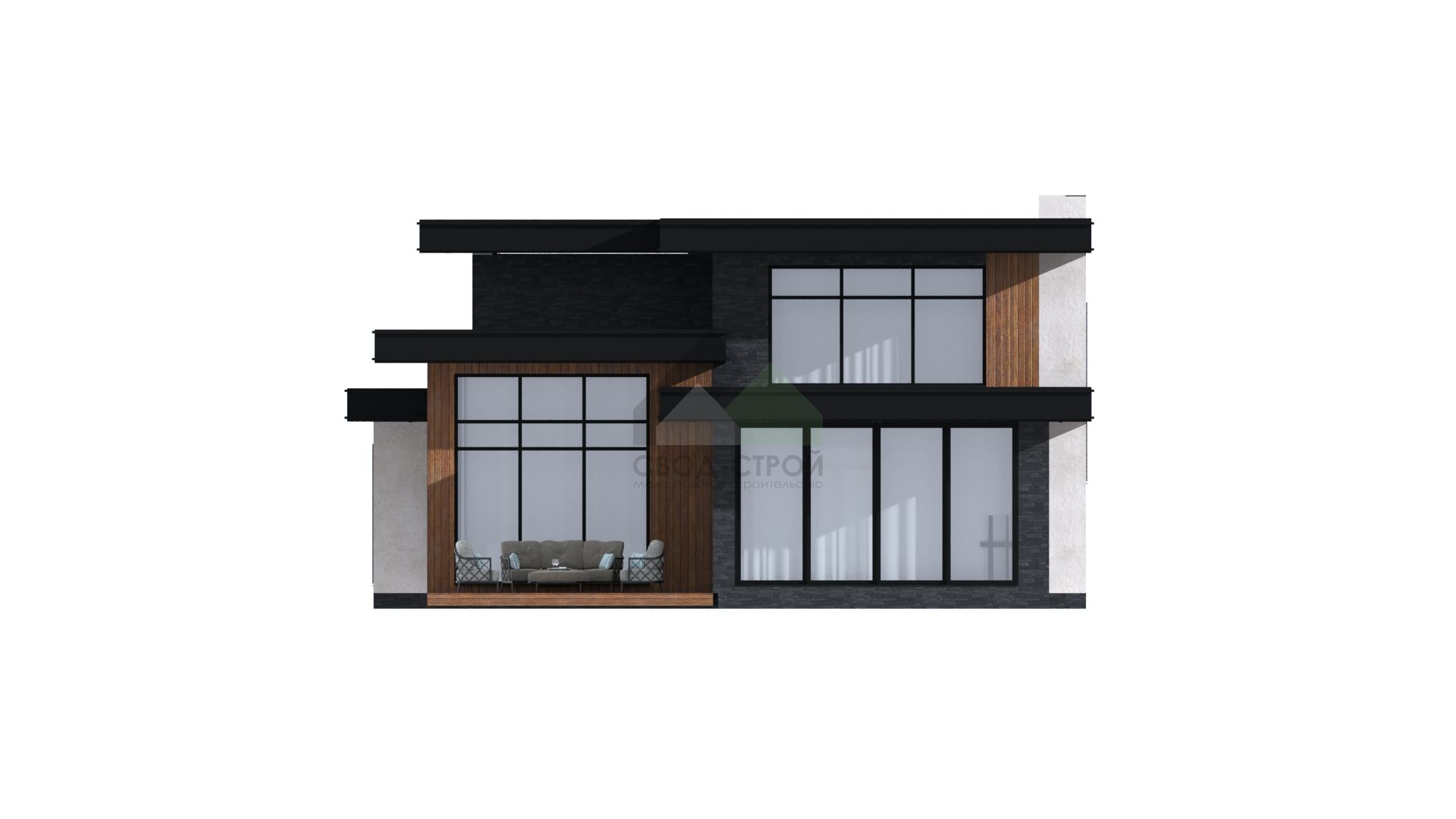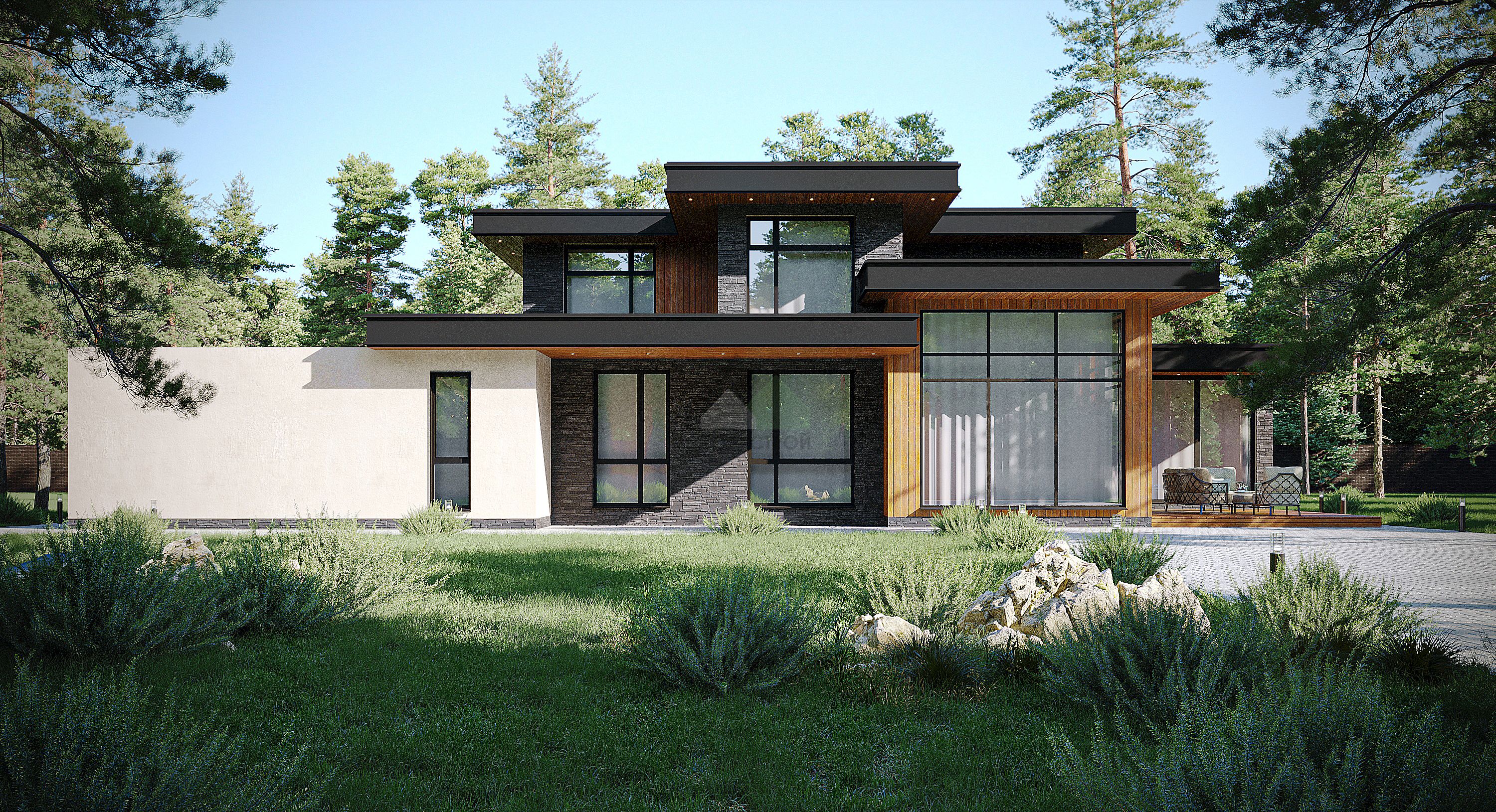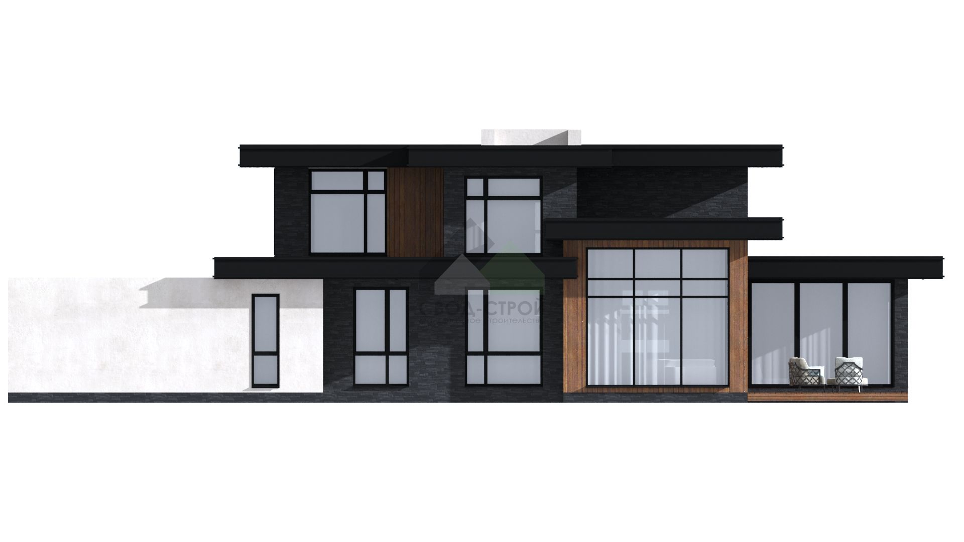 ЭкологичноГармонично впишем дом в ваш участок"Этот современный дом воплощение нашей мечты! Здесь сочетается стиль и комфорт. Изюминка этого проекта- двухсветная гостиная с панорамным остеклением, дающая возможность насладиться садом и солнцем, освещающим помещение."